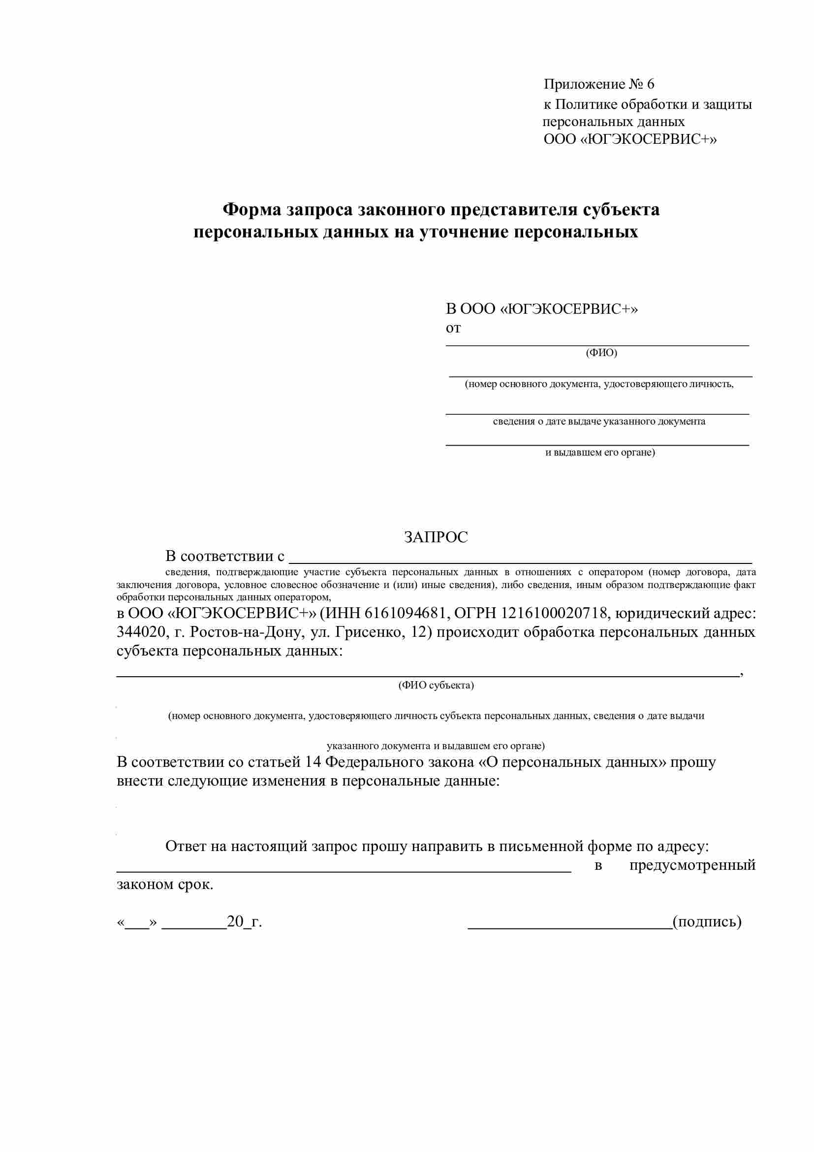 6.9. Для уточнения определенных персональных данных Субъекту (либо законному представителю) необходимо заполнить соответствующую форму запроса субъекта персональных данных на уточнение персональных данных (приложение 2 или 6) и передать лично работникам ООО «ЮГЭКОСЕРВИС+», принимающим обращения граждан, либо по почте.